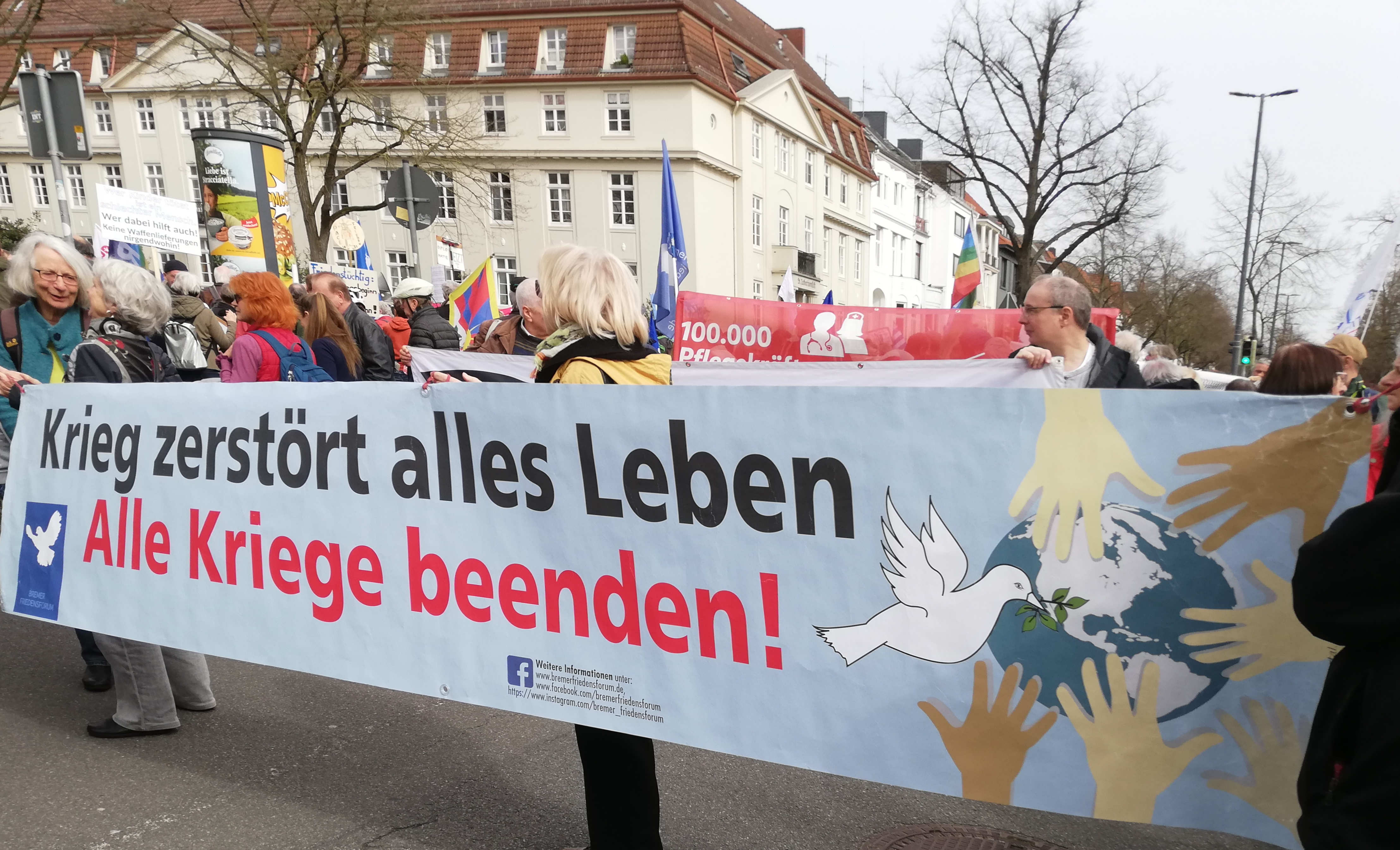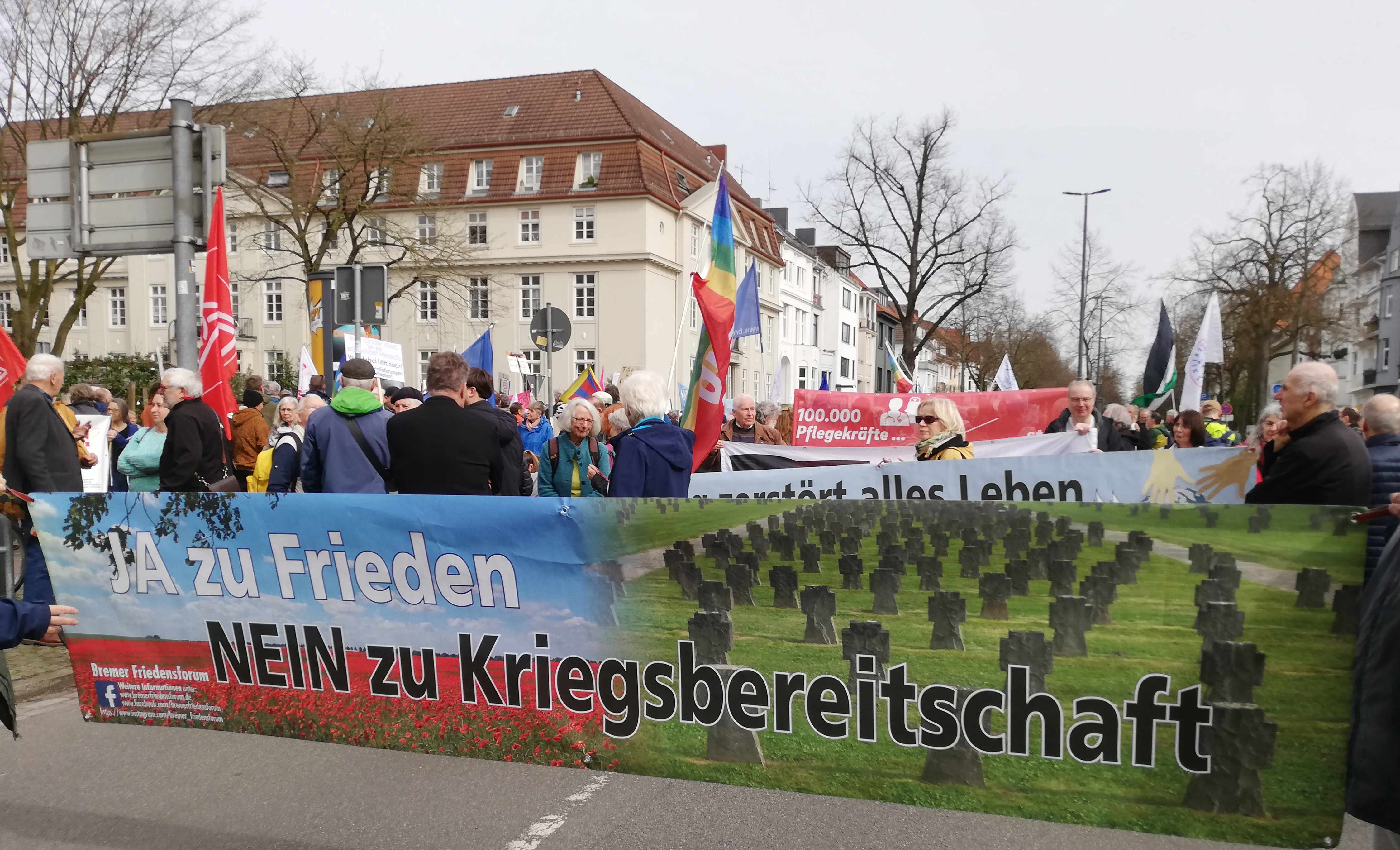 Ein bunter Zug mit ca. 1.500 Teilnehmern zog beim Ostermarsch in Bremen 2024 vom Friedenstunnel an der Parkallee über den Bahnhof zum Bremer Marktplatz. Dort hielt Zaklin Nastic, Bundestagsabgeordnete für das Bündnis Sahra Wagenknecht (BSW) eine bewegende Rede, in der sie die herrschende Kriegshysterie und die deutschen Waffenlieferungen in die Ukraine und an Israel anprangerte. Sie forderte einen sofortigen Waffenstillstand und humanitäre Hilfe. Der sog. "NATO-Wertewesten" und die deutsche Bundesregierung hat sich bereits 1999 komplett diskreditiert mit dem 78 Tage andauernden, nicht von der Uno gedeckten, Bombardement von hunderten von zivilen Einichtungen in Jugoslawien (als sog. "humanitäre Intervention" verkauft).